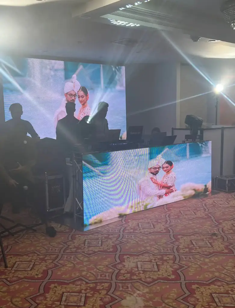 We design a high-impact audio-visual setup with professional sound systems, programmable lighting, LED uplights, projectors, TVs, and special effects like dry ice and cold sparks to elevate the atmosphere.